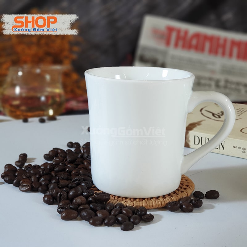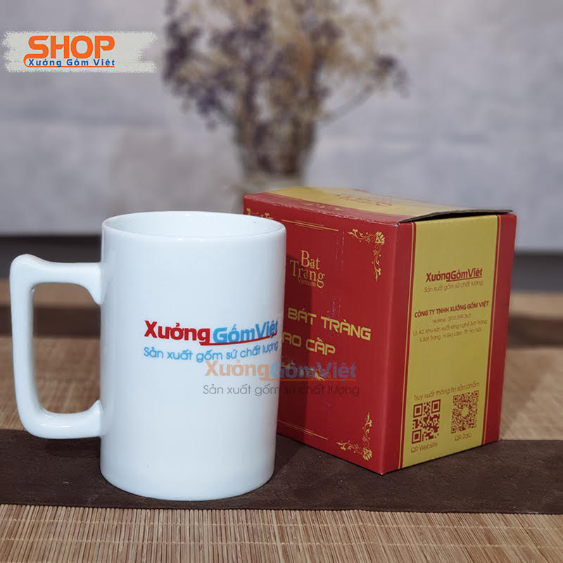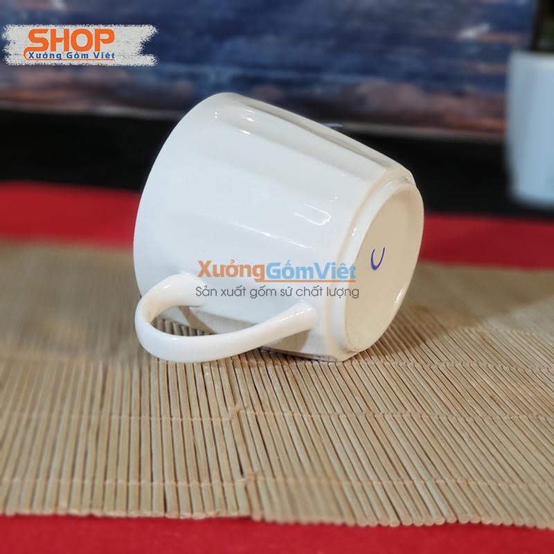 Cốc sứ trắng Bát Tràng in logo Xưởng Gốm Việt